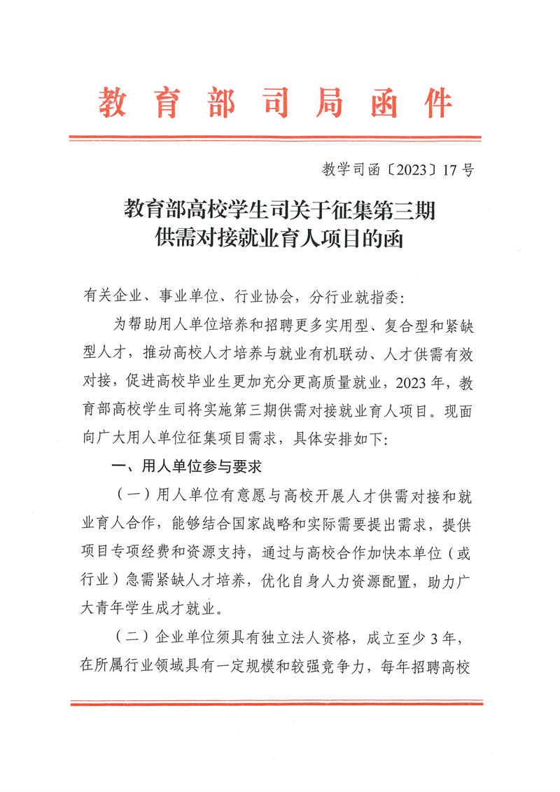 ??????根據《教育部高校學生司關于征集第三期供需對接就業育人項目的函》(教學司函[2023]17號),為推動水利人才培養與就業有機聯動、人才供需有效對接,歡迎各會員單位和有關水利單位可根據實際用人需求積極參與申報,在定向人才培養培訓、就業實習基地、人力資源提升、重點領域校企合作、重點群體就業幫扶等五類項目中按需提交項目指南,后期教育部將統一組織全國高校根據單位提交的項目指南開展校企對接活動。