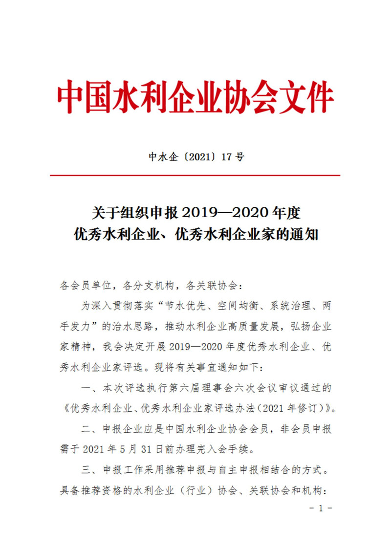 關(guān)于組織申報2019-2020年度優(yōu)秀水利企業(yè)、優(yōu)秀水利企業(yè)家的通知