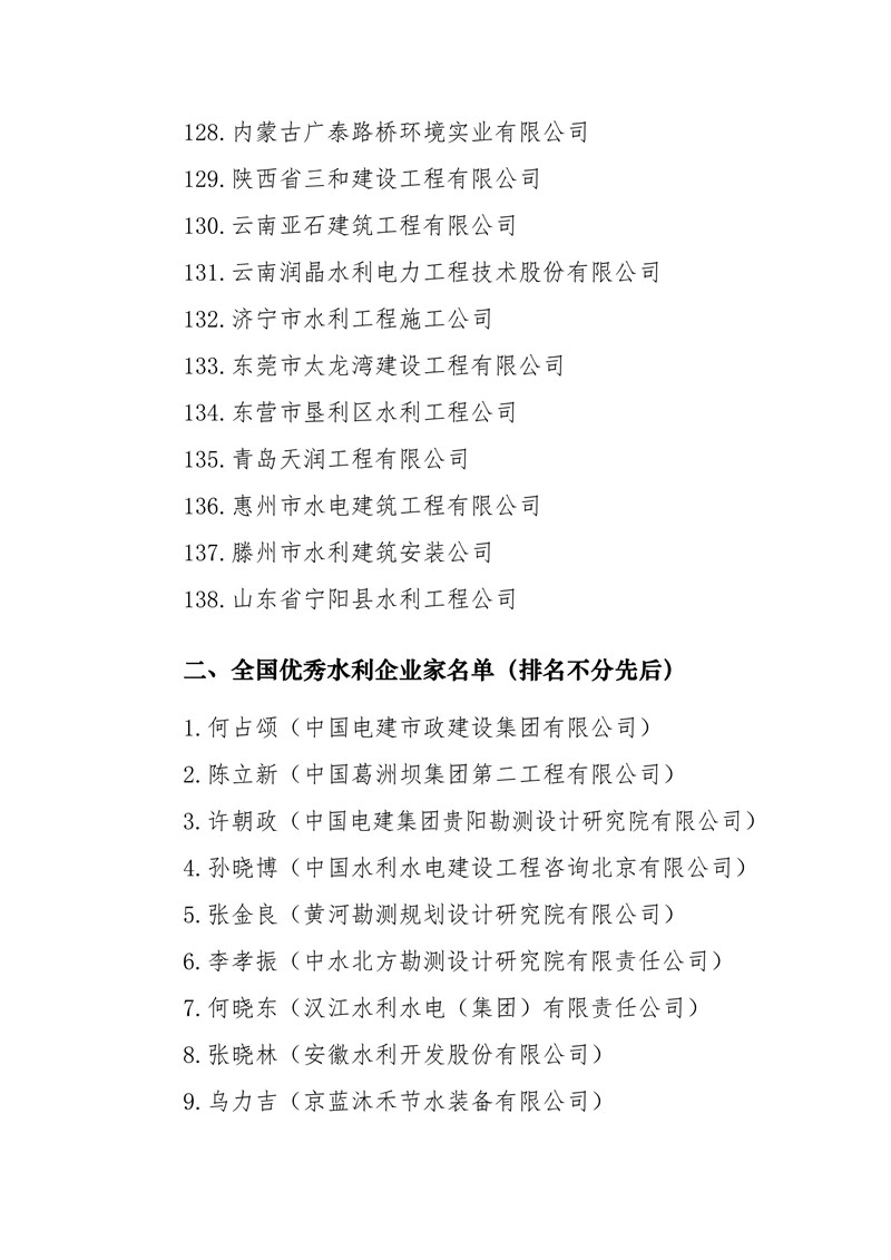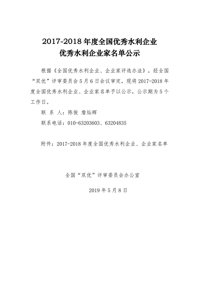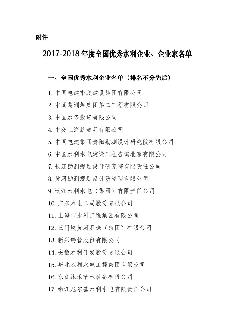 2017-2018年度全國優秀水利企業、優秀水利企業家名單公示