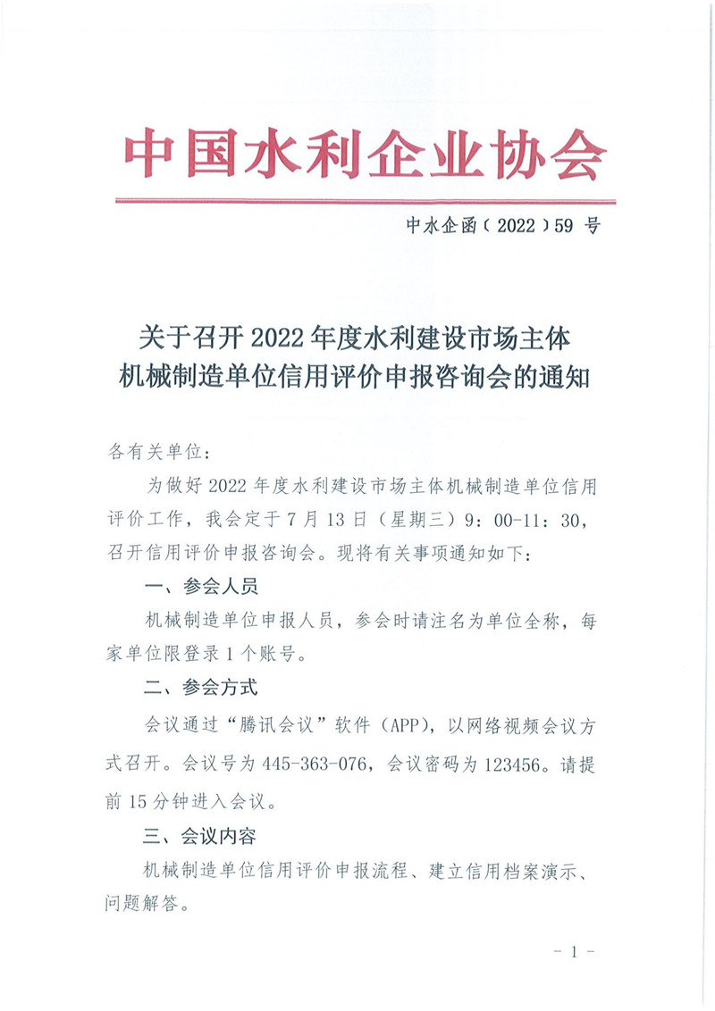 關(guān)于召開(kāi)2022年度水利建設(shè)市場(chǎng)主體機(jī)械制造單位信用評(píng)價(jià)申報(bào)咨詢(xún)會(huì)的通知