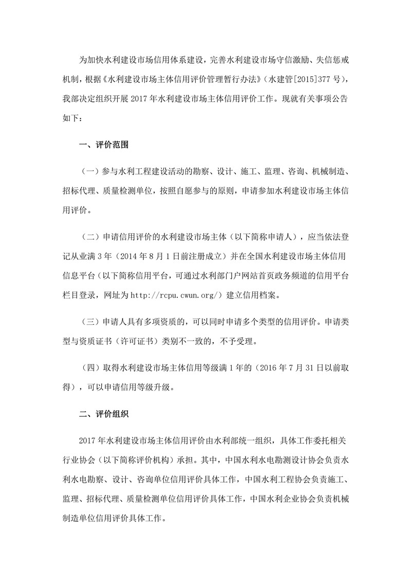 水利部關(guān)于開(kāi)展2017年水利建設(shè)市場(chǎng)主體信用評(píng)價(jià)工作的公告