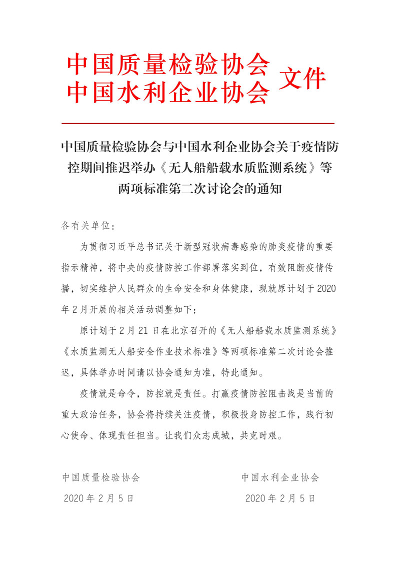 中國質量檢驗協會與中國水利企業協會關于疫情防控期間推遲舉辦《無人船舶載水質檢測系統》等兩項標準第二次討論會的通知