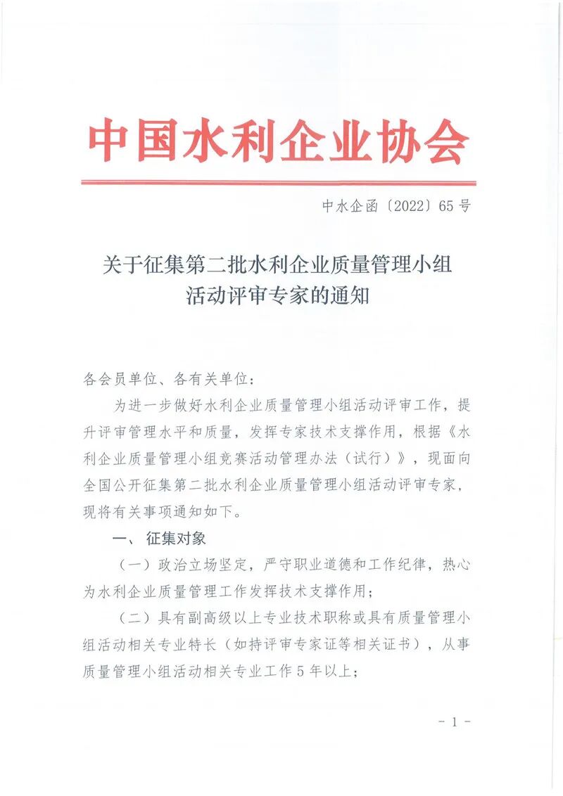 關(guān)于征集第二批水利企業(yè)質(zhì)量管理小組活動評審專家的通知