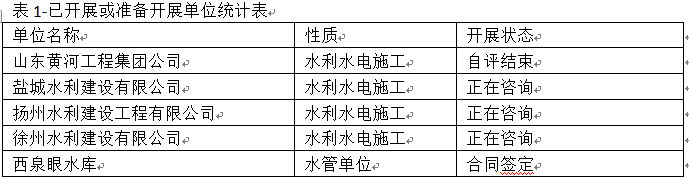 目前已聯系多家水利施工企業單位,其中三家有做水利安全生產標準化工作的想法,一家已達成工作意向,已開始了前期咨詢準備工作,另兩家正在協商。