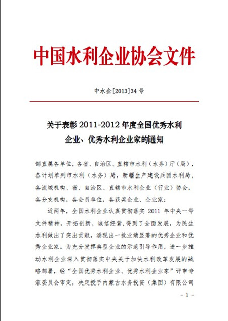 關(guān)于表彰2011-2012年度全國(guó)優(yōu)秀水利企業(yè)、優(yōu)秀水利企業(yè)家的通知