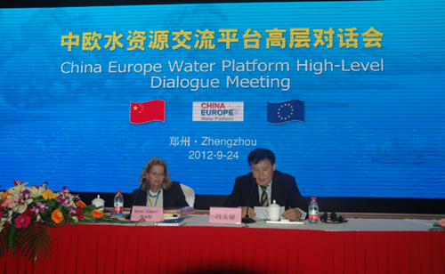 ??? 9月24日下午,第五屆黃河國際論壇舉辦前夕,中歐水資源交流平臺(tái)高層對(duì)話會(huì)在鄭州召開。水利部部長陳雷、丹麥環(huán)境部大臣奧肯、歐盟駐華大使艾德和出席開幕式并致辭。在開幕式上,陳雷與奧肯共同簽署了《中歐水資源交流平臺(tái)2012-2015年工作計(jì)劃》。