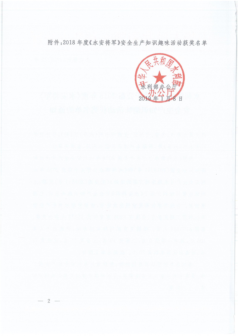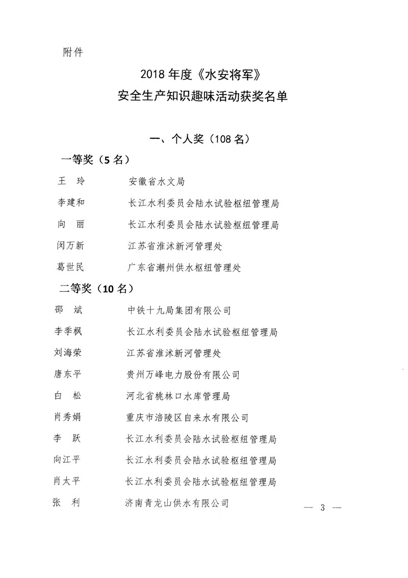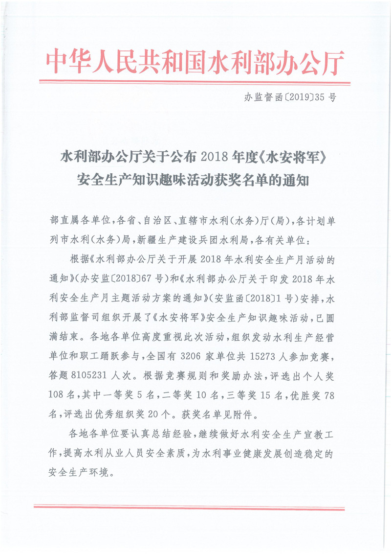 水利部辦公廳關(guān)于公布2018年度《水安將軍》安全生產(chǎn)知識(shí)趣味活動(dòng)獲獎(jiǎng)名單的通知