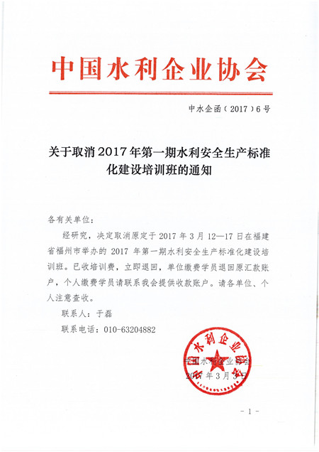 關(guān)于取消2017年第一期水利安全生產(chǎn)標(biāo)準(zhǔn)化建設(shè)培訓(xùn)班的通知
