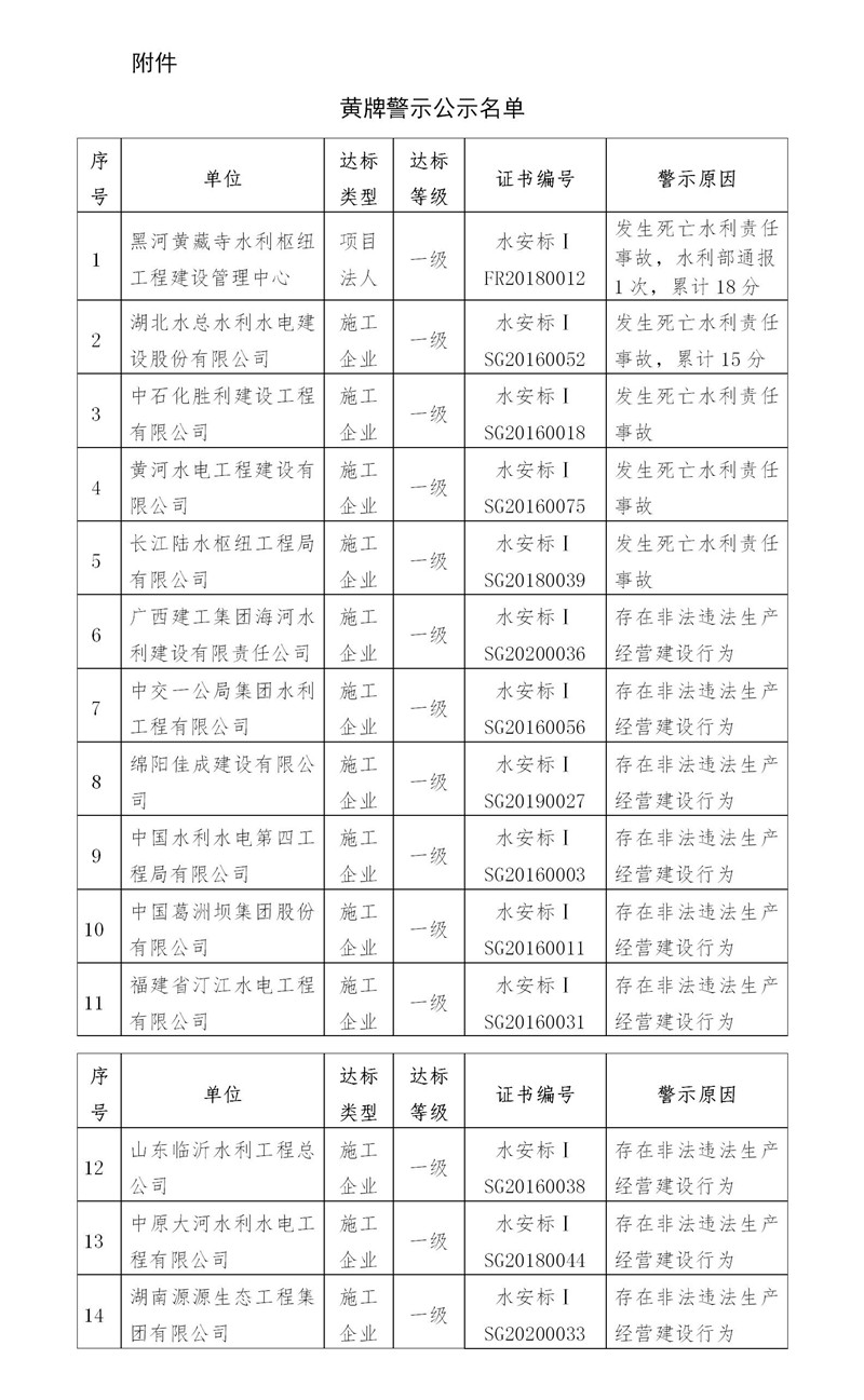 關于第一批水利安全生產標準化達標單位列入黃牌警示名單的公示